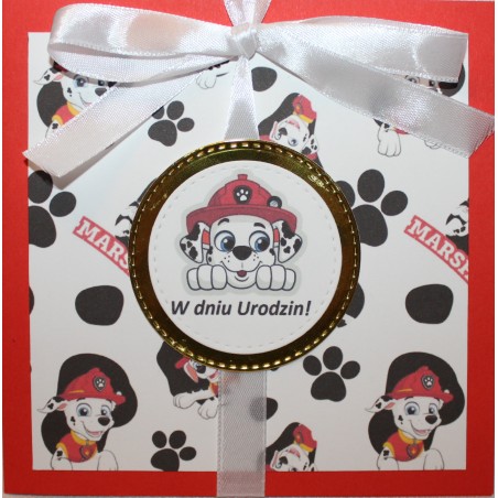 Kartka na urodziny dla dzieci Psi Patrol Marshall pies dalmatyńczyk + czerwona koperta.