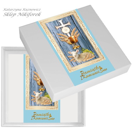 Kartka w pudełku na I Komunię Świętą niebieska z barankiem.