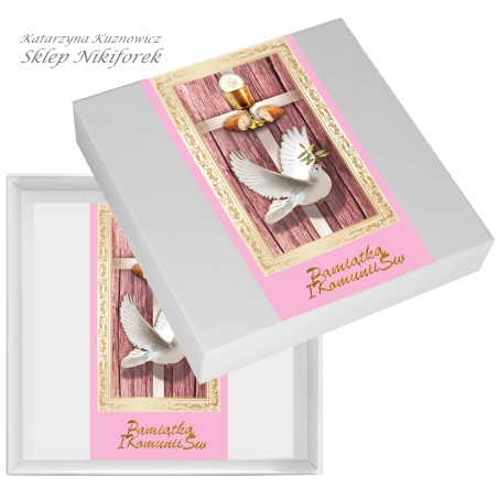 Kartka w białym pudełku na I Komunię Świętą różowa z gołąbkiem