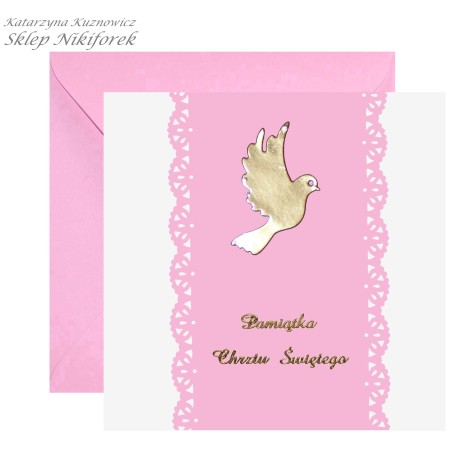 • Kartka na Chrzest Święty różowa ze złotym gołąbkiem