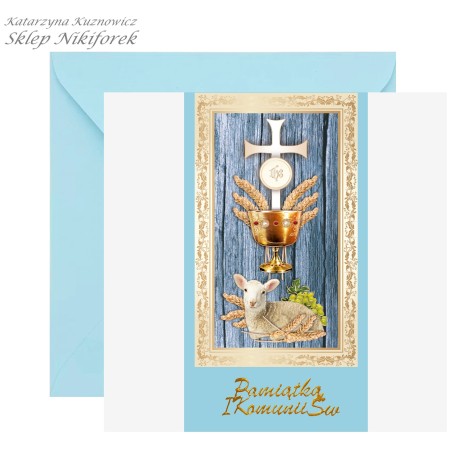 Kartka na Komunię niebieska baranek