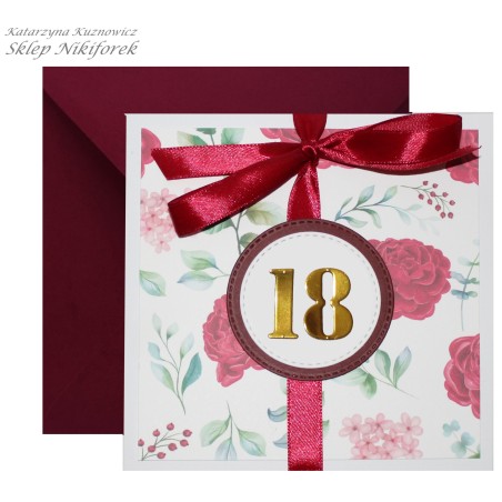 • Kartka na 18 urodziny bordowa w kwiaty