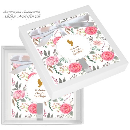 Kartka w białym pudełku na Chrzest Święty w różowe kwiaty róże dla dziewczynki.