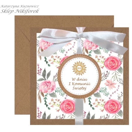 • Kartka na I Komunię Świętą brązowa eko kraft w różowe kwiaty róże