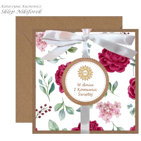 Kartka na I Komunię Świętą brązowa w kwiaty bordowe róże