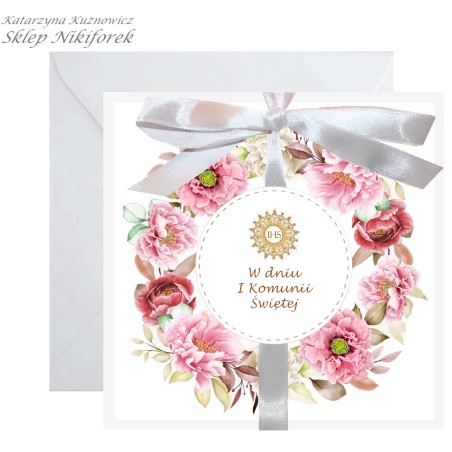 • Kartka na I Komunię Świętą biała w różowe kwiaty piwonie wianek
