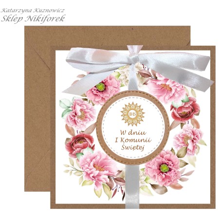 • Kartka na I Komunię Świętą brązowa w różowe kwiaty piwonie wianek