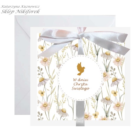 kartka na Chrzest Święty w kwiaty stokrotki rumianek biała kremowa ecru