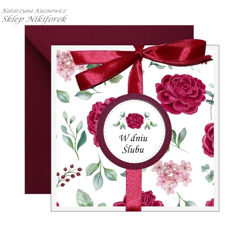 Kartka na ślub w kwiaty czerwone róże bordowa.