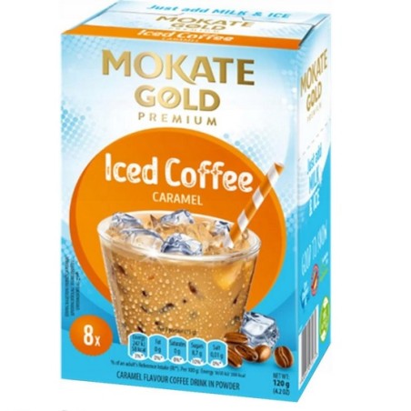 Kawa na zimno Mokate Iced Coffee karmelowa. 120g, w opakowaniu 8 saszetek z kawą.