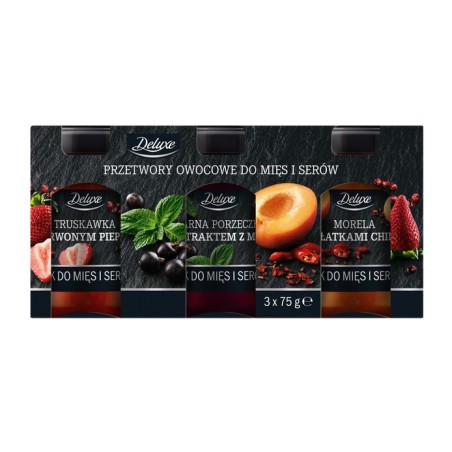 Deluxe - przetwory owocowe do mięs i serów. Zestaw 3 słoiczków po 75g. Trzy smaki - truskawka z pieprzem, czarna porzeczka z ekstraktem z mięty i morela z płatkami chili. Fajny, ciekawy zestaw do eksperymentów kulinarnych albo na prezent. Najszybciej pójdzie do paczkomatu Inpost.